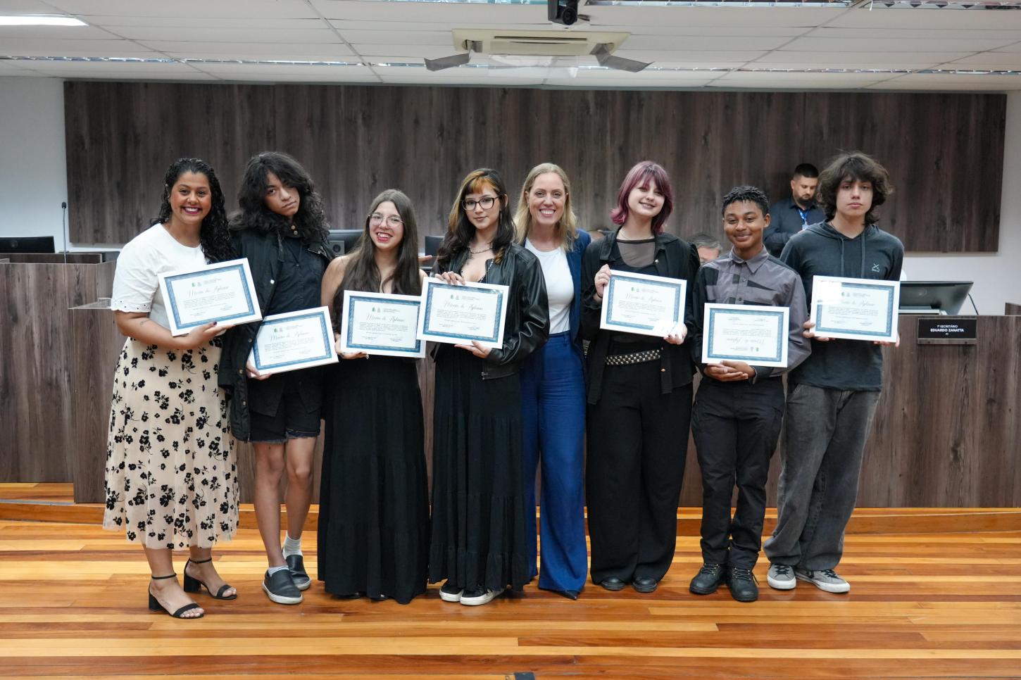 E a Moção 412/2025, da vereadora Jade Martins (MDB), é de aplauso aos alunos Tayla Emanuele França Dias, Kethlyn Laura Abech Dias Oliveira, Giovana Pacheco Nunes, Christopher Ramos Ribeiro do Amaral, Luis Felipe Tonial Ribas e Hiago Ferreira Machado, e aos Professores Rudinei Silveira e Jéssica Zagoto Bessa, pelo projeto “M.A.N.G.U.E – Movimento Ambiental para a Natureza, Geração, União e Ecobarreiras”, que será apresentado na Feira Estadual de Matemática.
