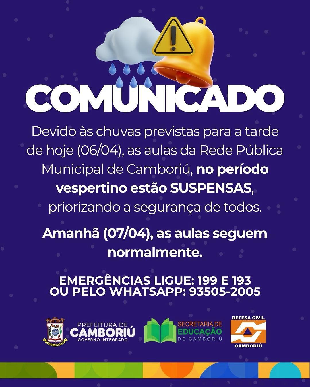A Secretaria de Educação do município, informa que as aulas foram suspensas em todas as unidades de ensino da cidade no período vespertino. Na terça-feira (07/04), as aulas ocorrerão normalmente.