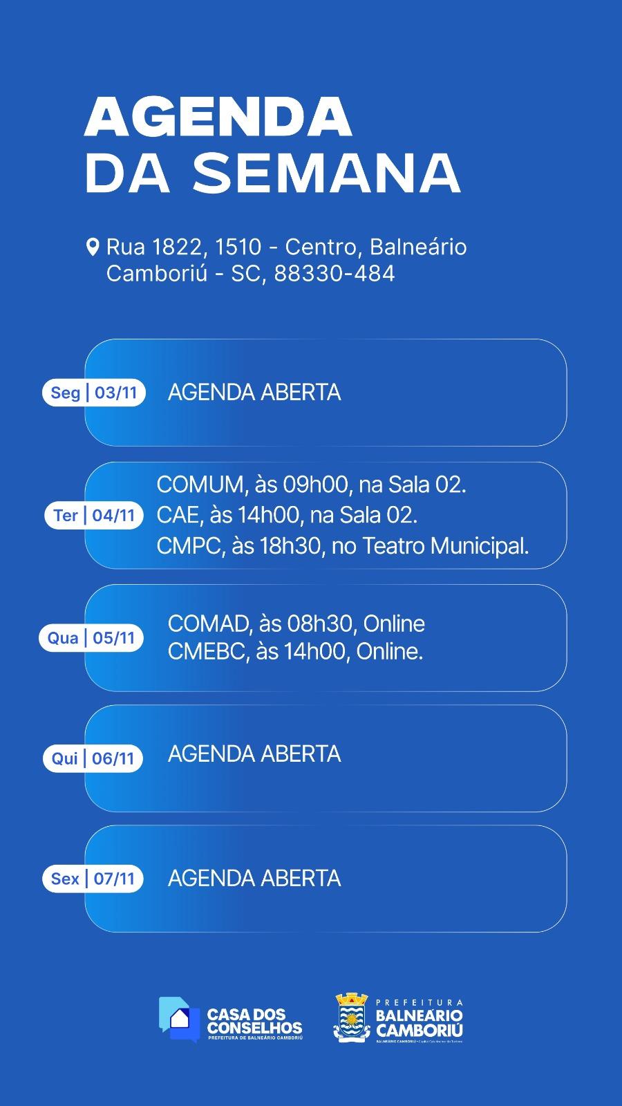 - quarta-feira (5) – 14h, reunião on-line do Conselho Municipal de Esportes de Balneário Camboriú.