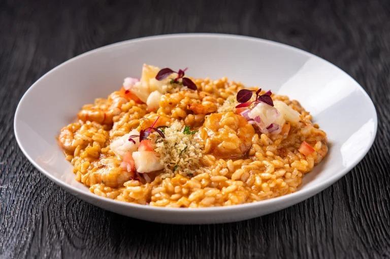 Risoto cremoso de camarão sete barbas salteado na cachaça artesanal de Luiz Alves, acompanhado de vinagrete de abacaxi com Melato de Bracatinga e finalizado com farofa defumada e brotos.
