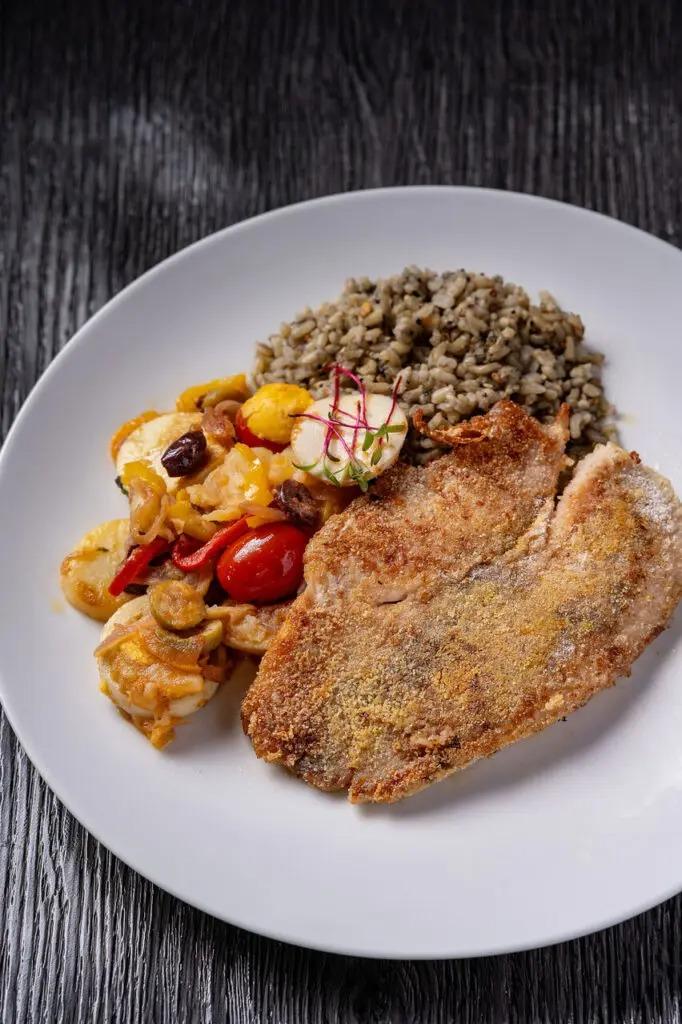 Tilápia grelhada à portuguesa, acompanhada de arroz mediterrâneo de grãos e sementes crocantes, finalizada com cebola roxa, pimentão colorido, tomate-cereja e azeitonas, ovo cozido e batatas. Acompanha arroz integral com quinoa e sementes puxadas no azeite de ervas e finalização com blend de óleos, azeite de oliva e ervas frescas.