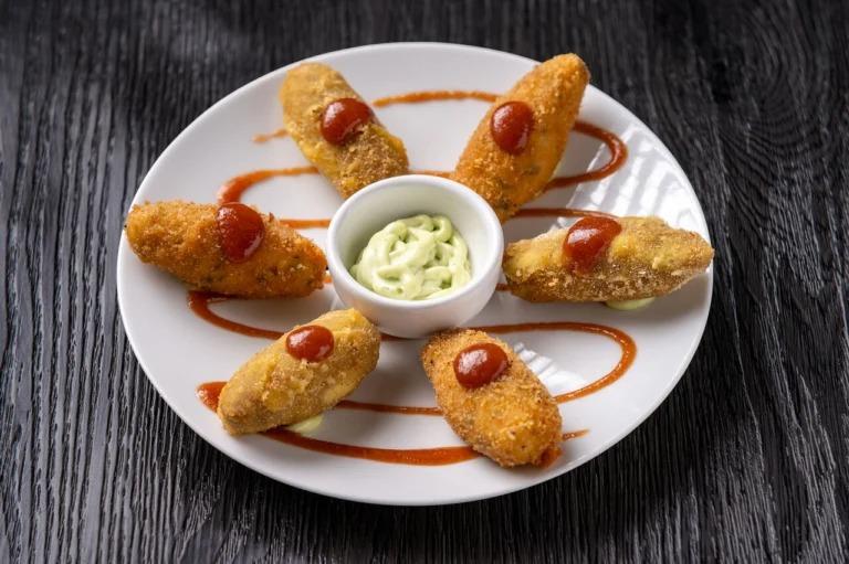 Três croquetes de Linguiça Blumenau e três croquetes de provolone. Empanados na panko e servidos com barbecue de goiaba com Melato de Bracatinga e maionese verde defumada.