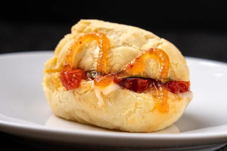 Versão vegana do tradicional pão de queijo, recheado com mandioqueijo, tomate confit e manjericão, finalizado com geleia de pimenta com cachaça de Luiz Alves.