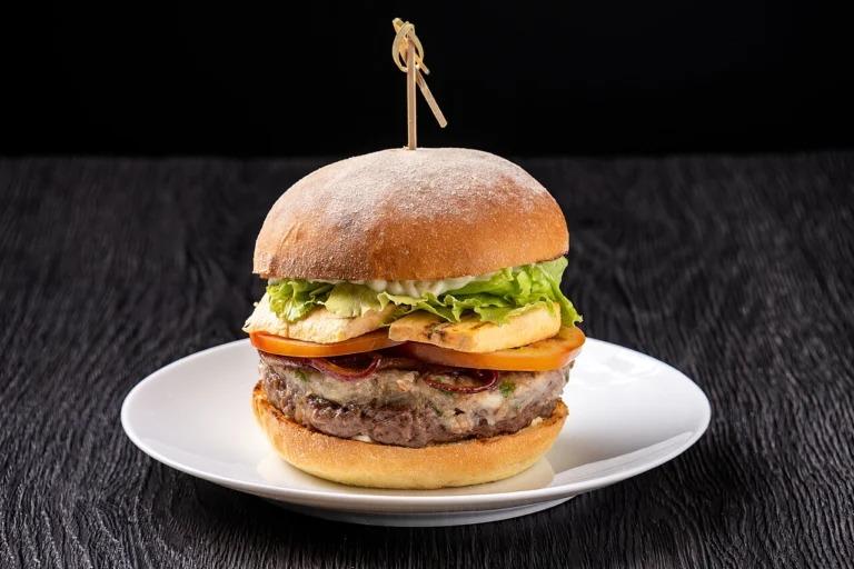 Pão de milho com hambúrguer da casa na brasa, queijo coalho, creme de aipim, carne seca, cebola caramelizada com Melato de Bracatinga, banana-da-terra frita e maionese especial.