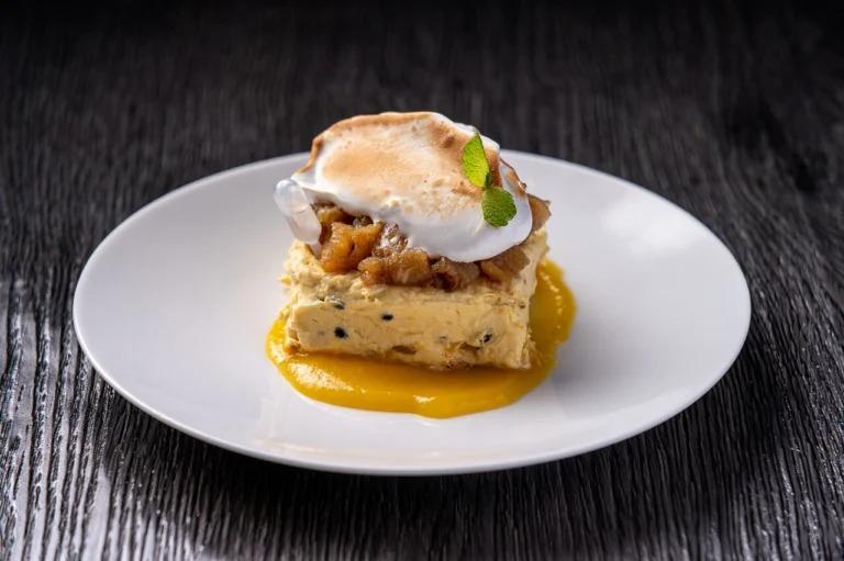 Massa sablé com coco queimado, mousse de manga e maracujá, abacaxi caramelizado no açúcar mascavo e flambado com cachaça artesanal de Luiz Alves. Finalização com merengue suíço maçaricado e toque de coco queimado. Acompanha uma pepita de cachaça.