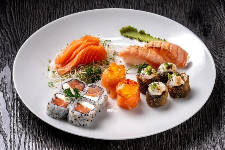 Combo com 4 uramakis Filadélfia; 2 joes com geleia de pimenta; 4 hot Filadélfia com Mel de Bracatinga; 4 sashimis com flor de sal e azeite trufado; e 2 niguiris de salmão.
