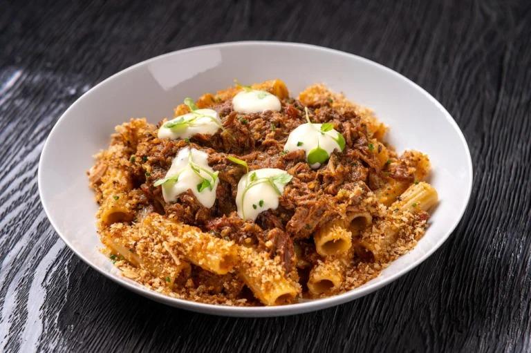 Rigattoni com ragu de fraldinha assada e farofinha crocante de amêndoas, finalizado com creme de queijo diamante e mini brotos.
