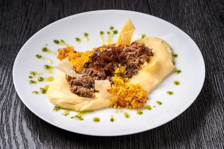Purê de aipim cremoso com costela bovina temperada, cebola caramelizada, crocantes de aipim e pesto de ervas frescas. Acompanha farofa de banana-da-terra.