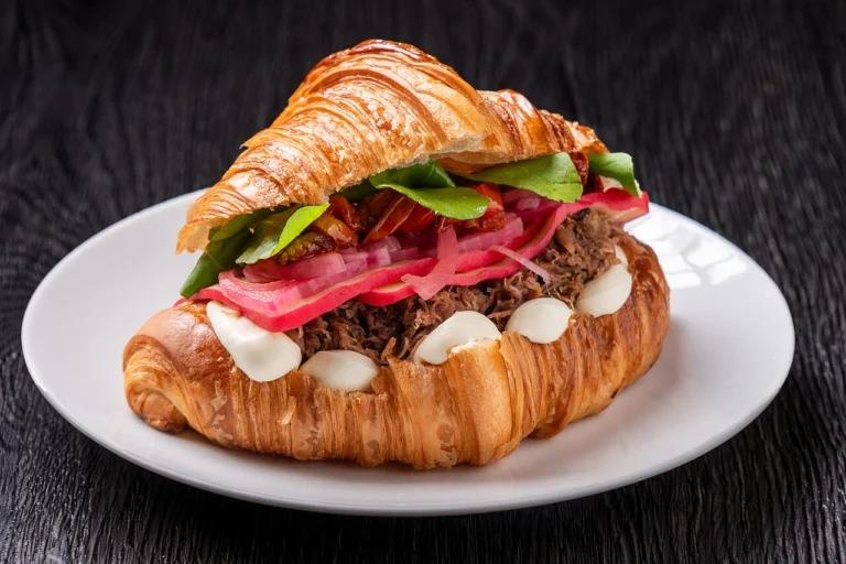 Croissant artesanal com creme de queijo, costela bovina cozida lentamente na cerveja IPA, queijo gouda, tomate assado com orégano e picles de cebola-roxa, finalizado com rúcula fresca.