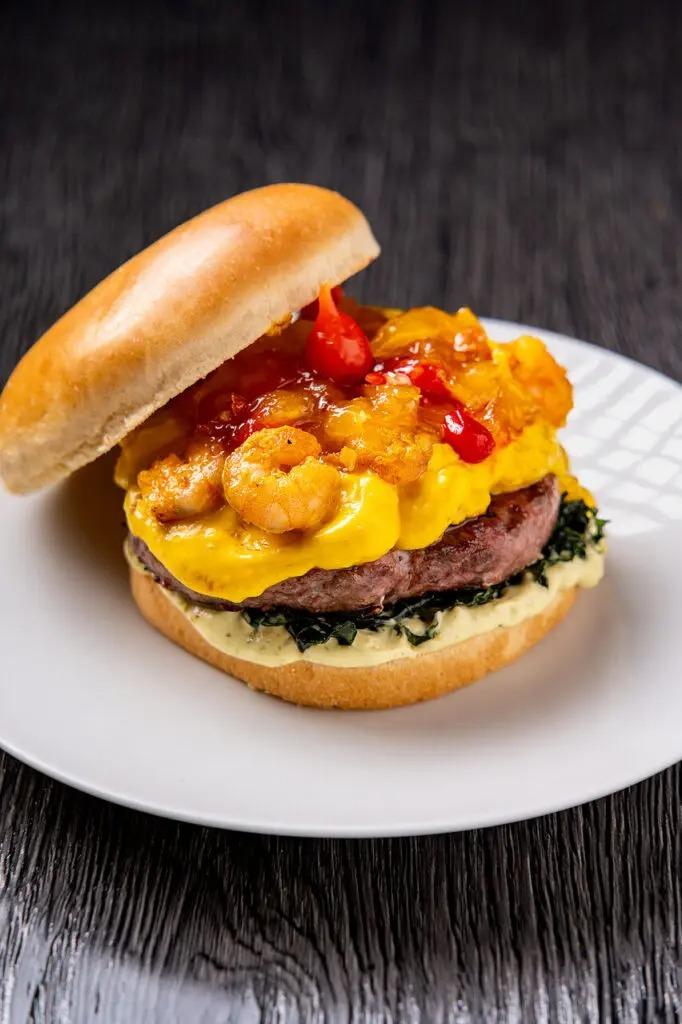 Hambúrguer feito com blend de carne bovina e linguiça Blumenau, servido no pão brioche com bobó de camarão ao catupiry, maionese verde, couve frita e chutney de manga com pimenta biquinho.