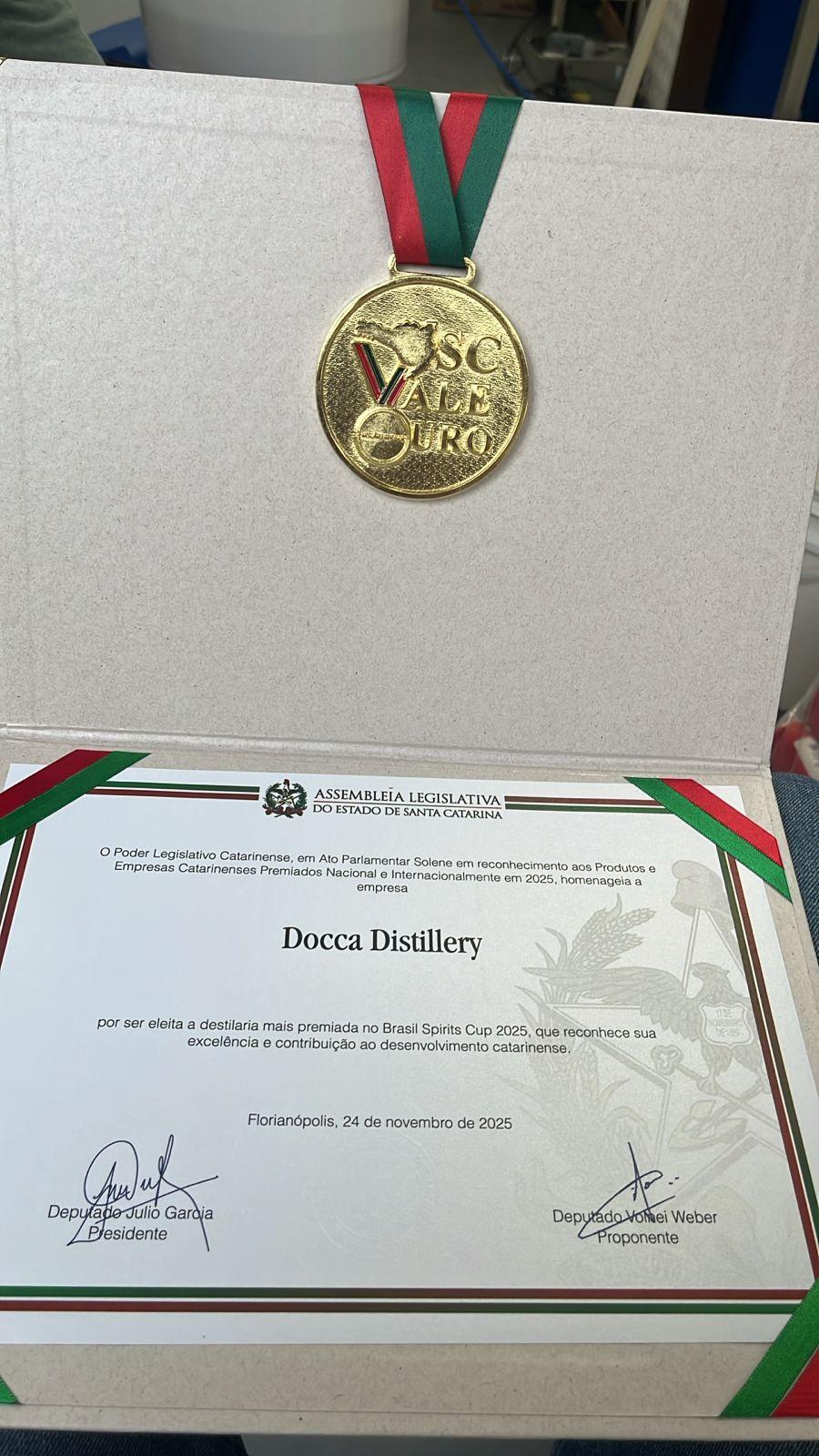 A Docca Distillery, de Camboriú, foi reconhecida na última segunda-feira (24) com o selo SC Vale Ouro, durante cerimônia na Assembleia Legislativa de Santa Catarina (Alesc). A distinção destaca empresas que contribuíram para fortalecer a imagem do estado e impulsionar o desenvolvimento catarinense ao longo de 2025.