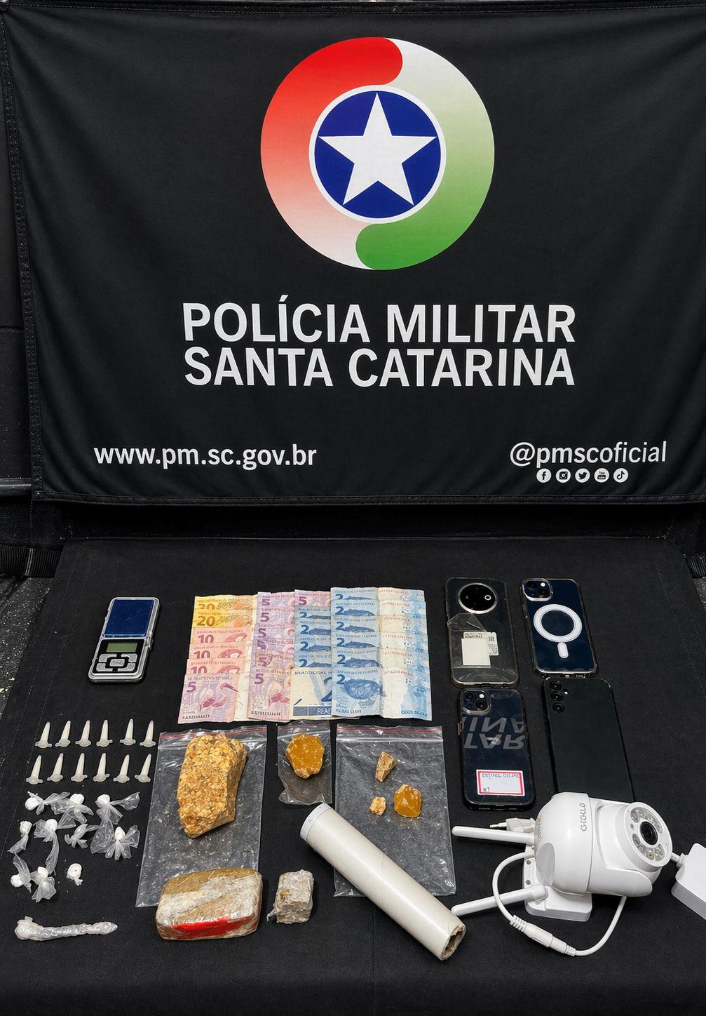 Também foram apreendidos uma balança de precisão, materiais utilizados para embalar e fracionar entorpecentes, uma câmera de monitoramento e quatro aparelhos celulares, os quais apresentavam diversas notificações relacionadas ao tráfico de drogas.