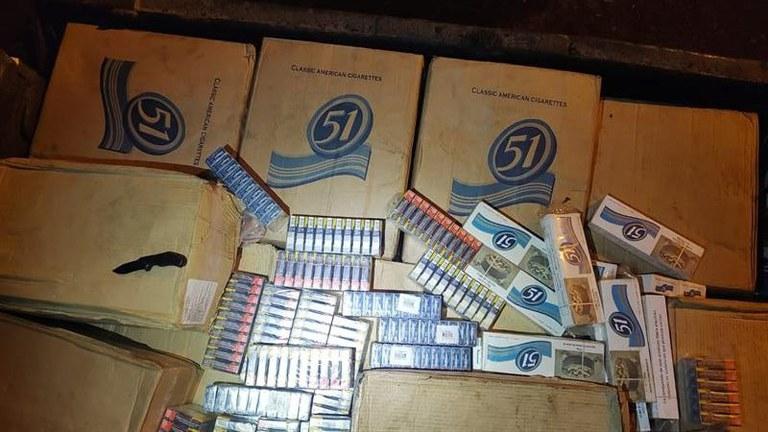 Dentro do caminhão, foram encontradas cerca de sete toneladas de camarão de origem estrangeira e aproximadamente 50 mil carteiras de cigarros contrabandeados.